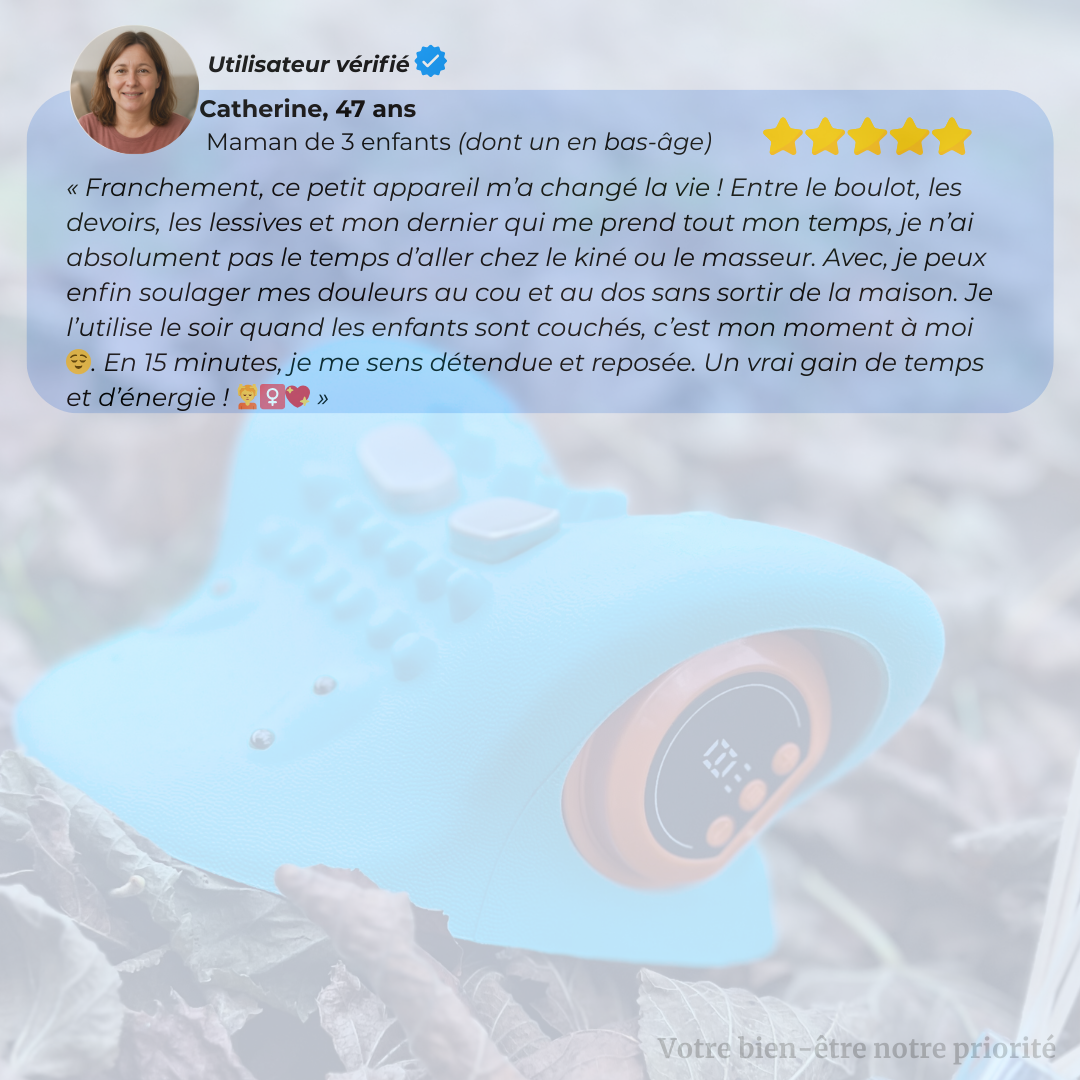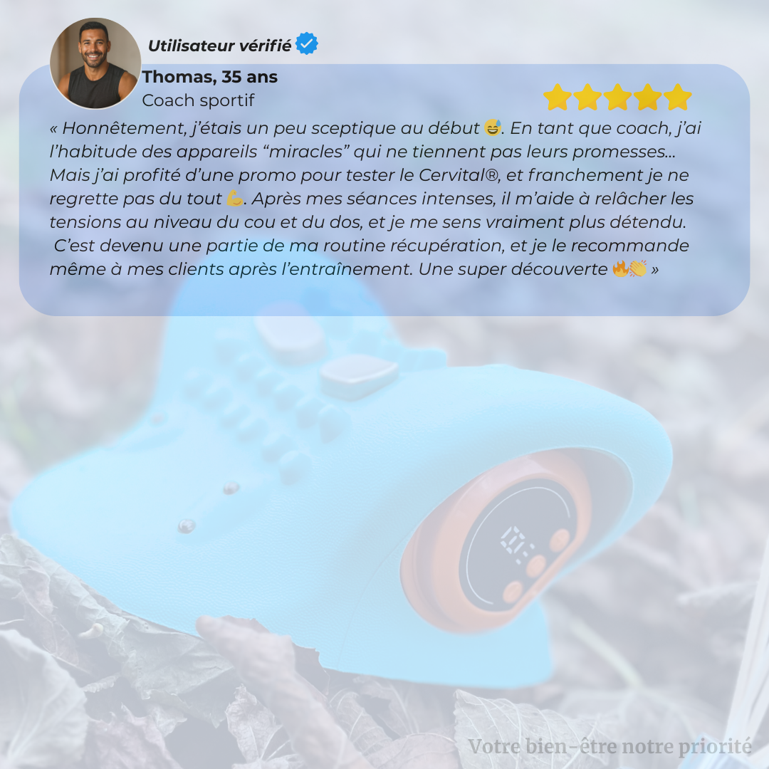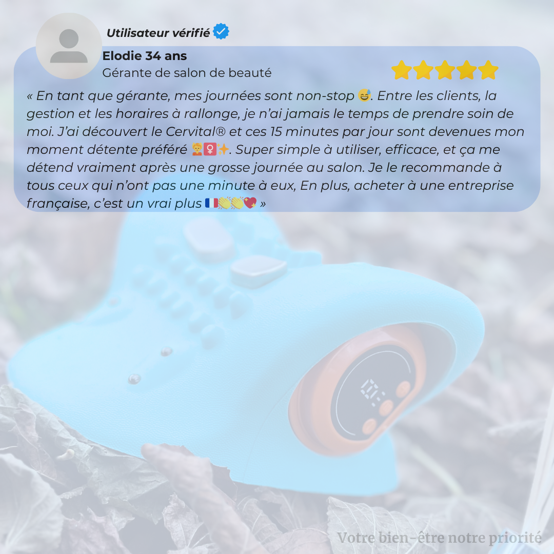 Oui. Cervital a été pensé pour relâcher naturellement les tensions accumulées dans la zone du cou grâce à sa courbure ergonomique à 26°. Beaucoup d’utilisateurs décrivent une sensation de légèreté et de détente dès les premières minutes d’utilisation. Un vrai moment de relaxation à domicile.